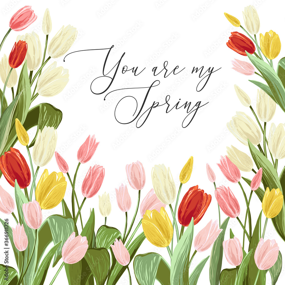 You are my spring quote, pink, white, yellow, red tulips bouquet